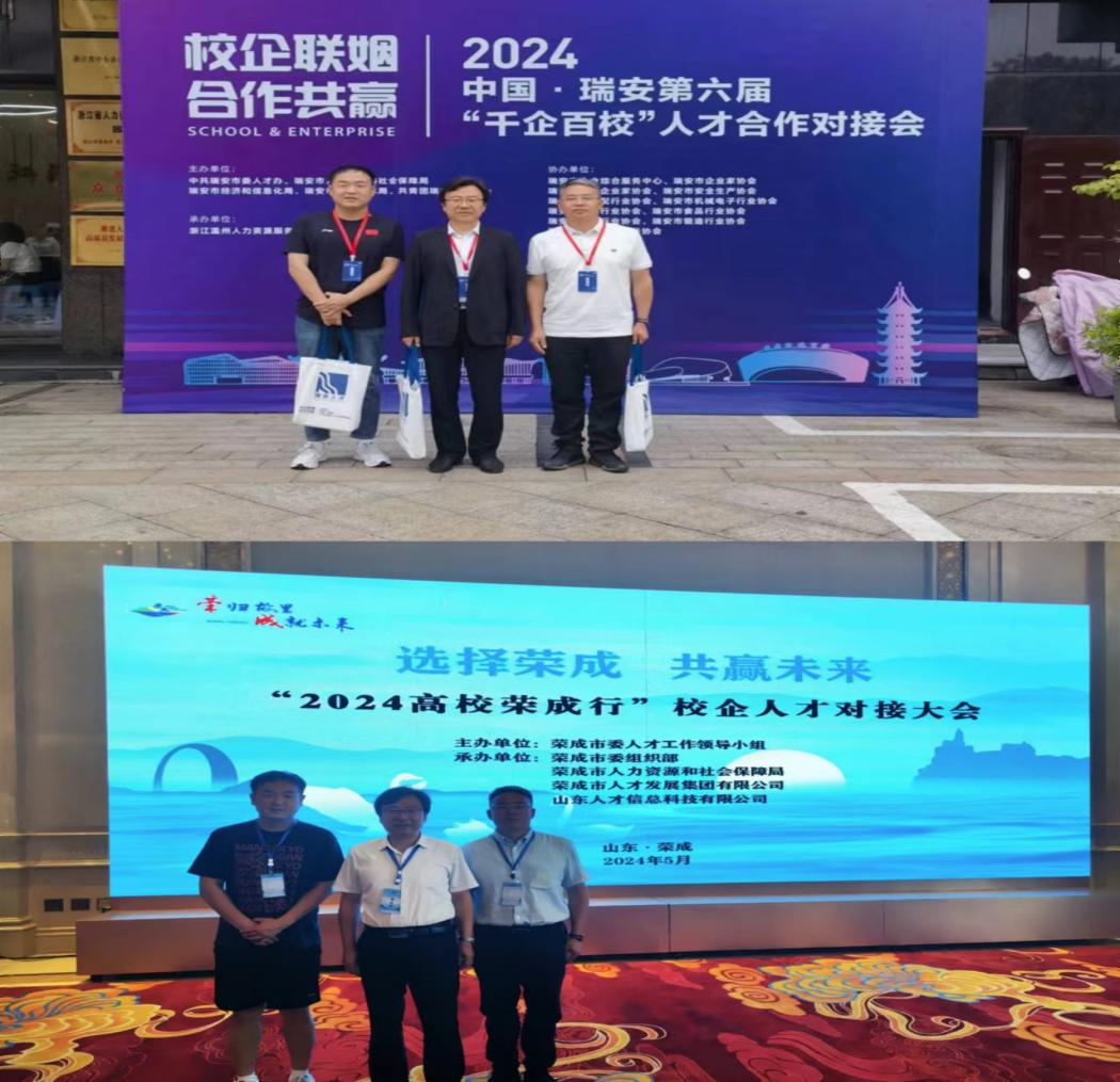 22日上午,一行参加2024中国·瑞安第六届“千企百校”人才合作对接会,高国礼书记代表公司就业指导服务中心授领“高校人才工作联络站”站牌并对接洽谈校企合作与现场招聘。