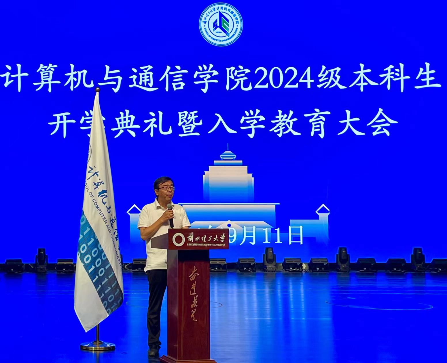 2024年9月12日晚上,计算机与通信公司在彭家坪校区老员工活动中心红柳剧场举行了2024级本科生开学典礼暨入学教育大会。公司经理冯涛、党委书记高国礼、副经理年福忠、李晓旭、张玺君,各学科组负责人、全体辅导员、新任班主任代表及2024级全体本科生参加了会议。公司党委副书记来明展主持此次活动。此次活动共分为开学典礼、入学教育大会两个阶段。
