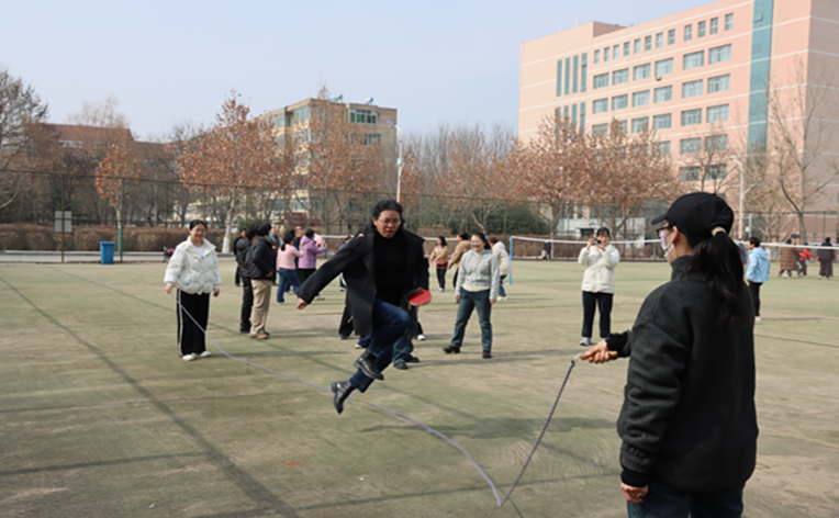 趣味活动设置了同心鼓、跳大绳和乒乓球端球三个群体项目。女教师们在明媚的春光中,精神饱满地参加到活动中。同心鼓项目中,大家分成几个小组,每组队员手持绳牵鼓面,默契协作努力让抛向空中的排球在鼓面上跳动次数更多、持续时间更久。在活动中,女教师们相互鼓励、相互帮助,加深了友谊,增强了团队意识。